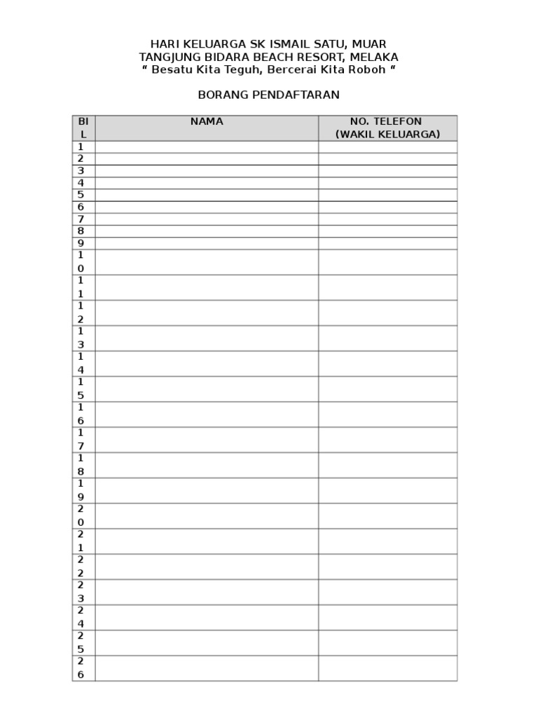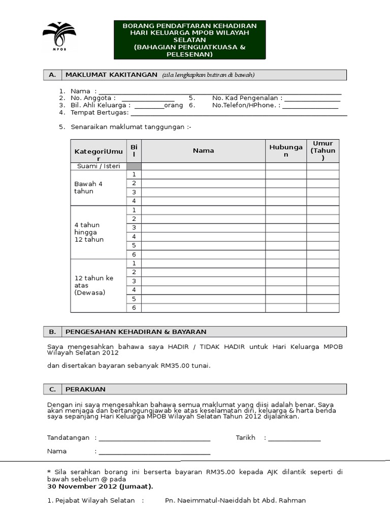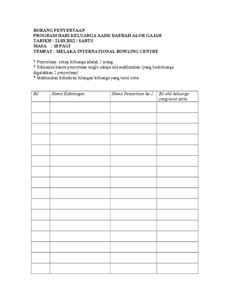 Makan dan minum RM2000 x 2 hari x 70 orang RM280000 RM1500 x 2 hari x 50 orang RM150000 3. Muat Turun Borang Penyertaan Syarat. Ahli Keluarga Ahli Kelab IsteriSuami dan anak-anak berumur 18 tahun ke atas adalah dibenarkan menyertai perlawanan ini dengan.